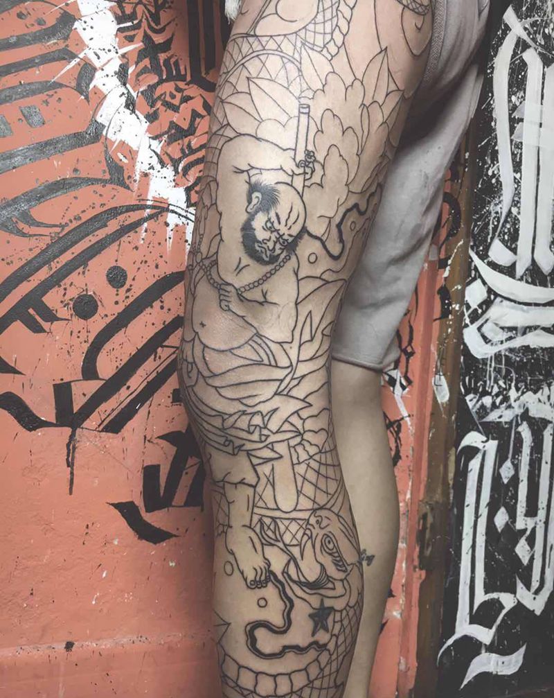 • T网红王老大花腿龙纹身图片_腿部新传统纹身图案
