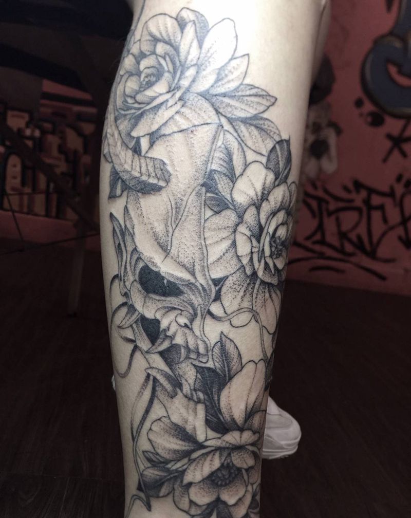 般若素花纹身图片_腿部纹身图案