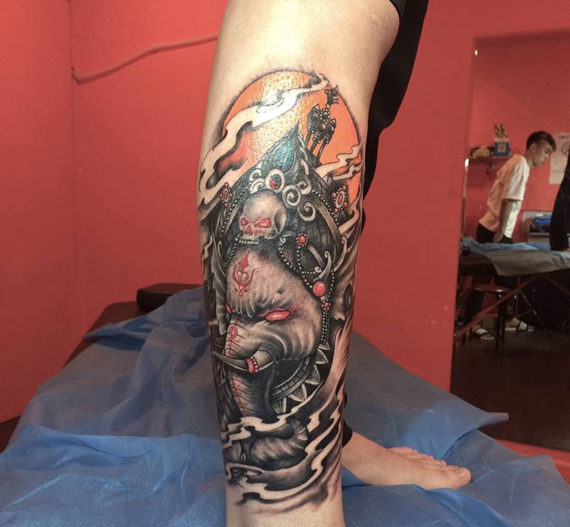 当前位置: 首页 >广东省肇庆市纹身店-黑兔刺青纹身馆纹身图案>象神纹身图片_腿部老传统纹身图案