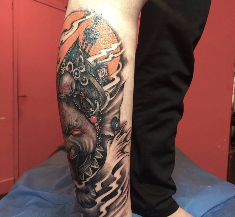 当前位置: 首页 >广东省肇庆市纹身店-黑兔刺青纹身馆纹身图案>象神纹身图片_腿部老传统纹身图案
