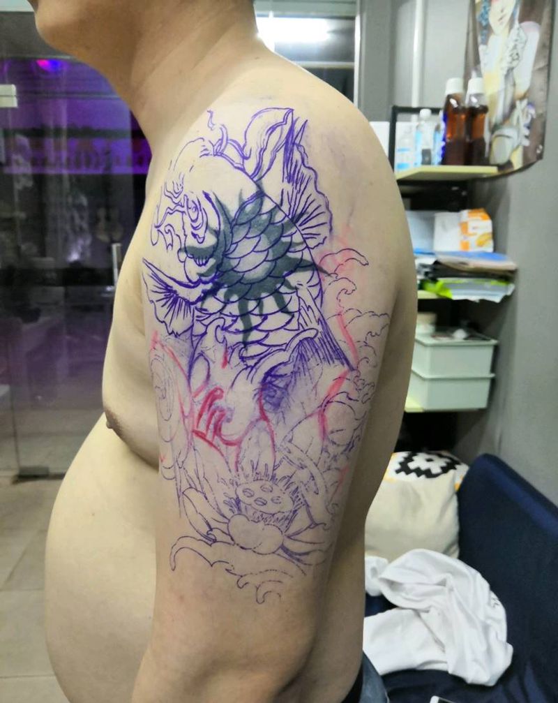 • T网红王老大花腿龙纹身图片_腿部新传统纹身图案