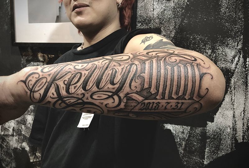 当前位置: 首页 >广东省惠州市纹身店-不开心刺青纹身图案>原创手绘花体字纹身图片_手臂手部花体字纹身图案