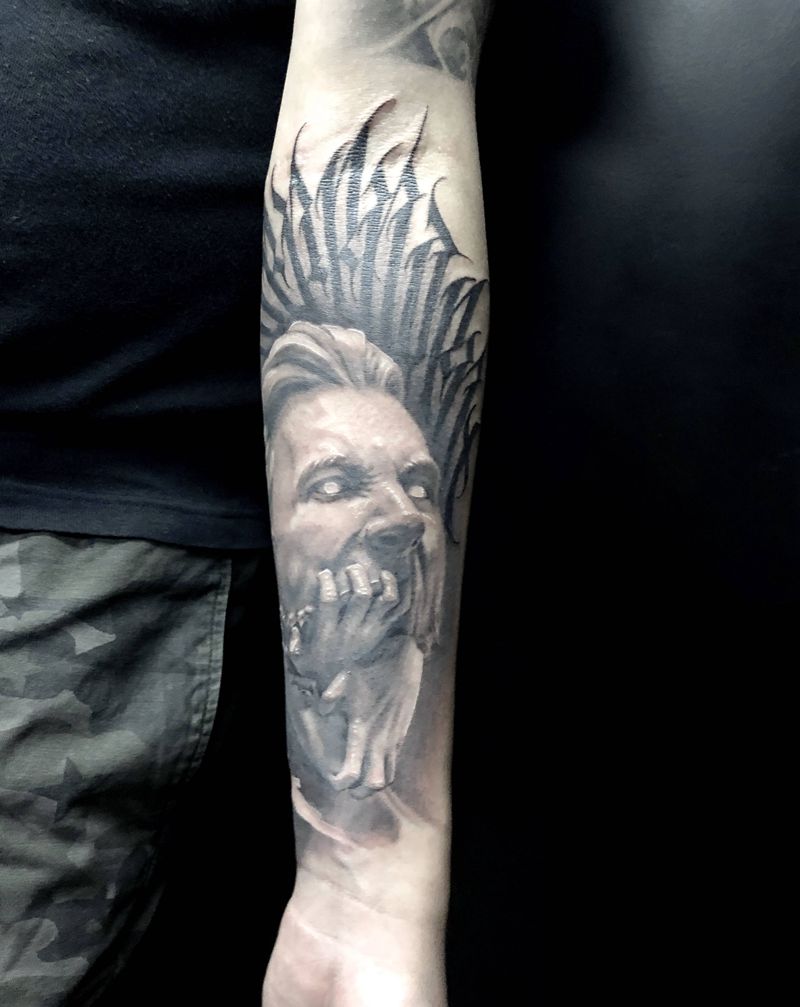 当前位置: 首页 >广东省惠州市纹身店-不开心刺青纹身图案>写实人物加花体字纹身图片_手臂手部欧美写实花体字纹身图案