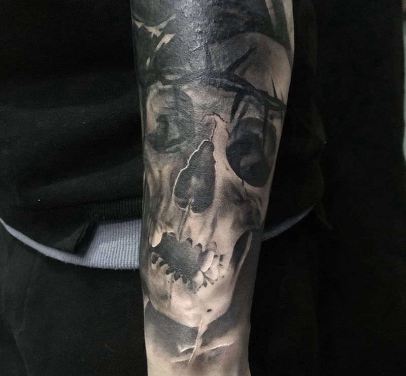 骷髅头遮盖纹身图片_手部欧美写实遮盖纹身图案