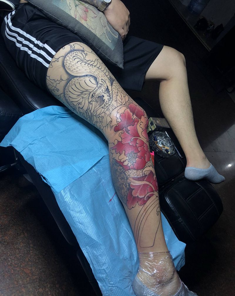 • T网红王老大花腿龙纹身图片_腿部新传统纹身图案