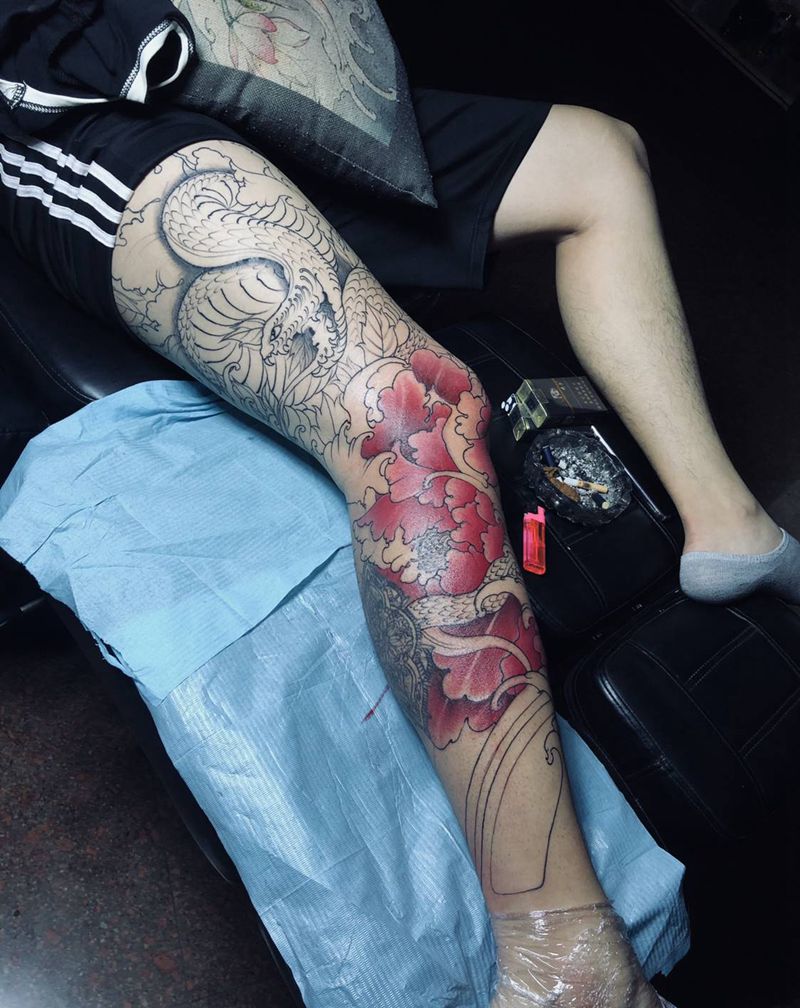 • T网红王老大花腿龙纹身图片_腿部新传统纹身图案