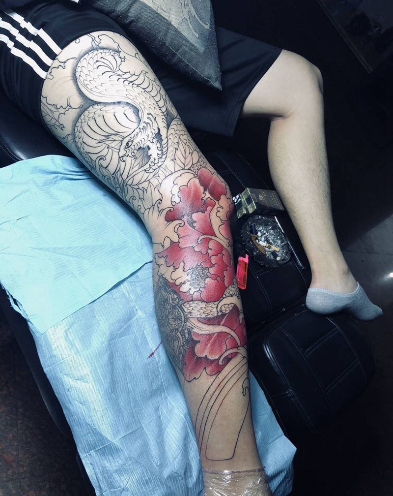 • T网红王老大花腿龙纹身图片_腿部新传统纹身图案