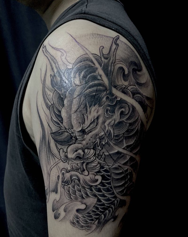 • T网红王老大花腿龙纹身图片_腿部新传统纹身图案