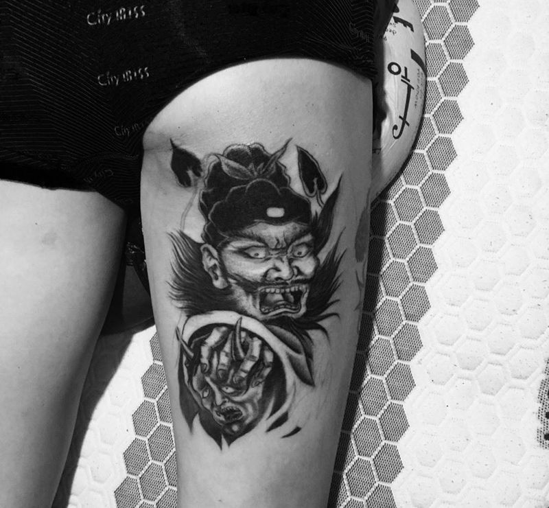 当前位置: 首页 >广东省惠州市纹身店-宏刺青纹身图案>钟馗捉鬼-未完成纹身图片