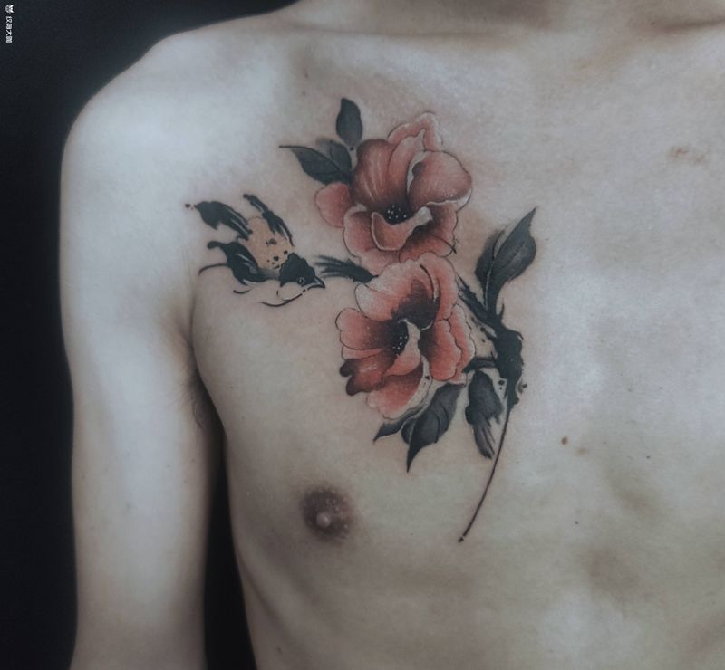 水墨花鸟纹身图片_胸部水墨水彩花鸟水墨纹身图案