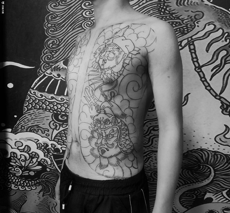 当前位置: 首页 >广东省惠州市纹身店-惠州山海刺青纹身工作室纹身图案>开衫线条纹身图片_胸部腹部老传统福禄寿大黑天比沙门天纹身图案
