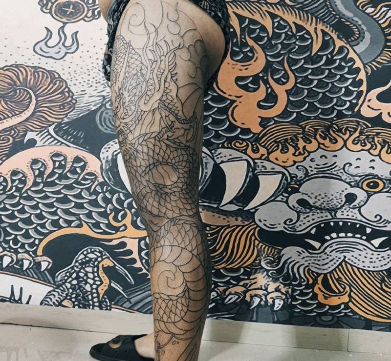 • T网红王老大花腿龙纹身图片_腿部新传统纹身图案