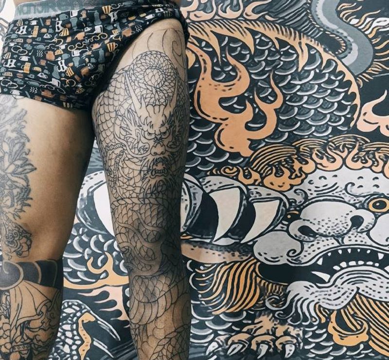 • T网红王老大花腿龙纹身图片_腿部新传统纹身图案