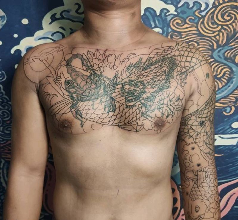 当前位置: 首页 >广东省惠州市纹身店-惠州山海刺青纹身工作室纹身图案>老传统鲤鱼遮盖纹身图片_手臂胸部老传统鲤鱼老传统日式纹身图案