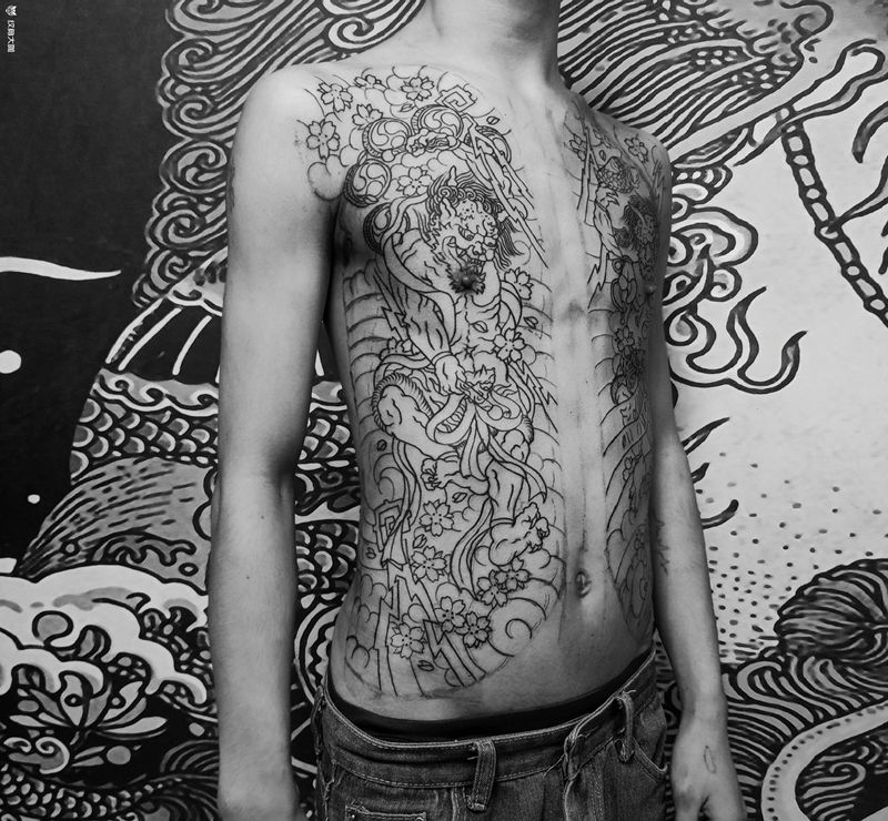当前位置: 首页 >广东省惠州市纹身店-惠州山海刺青纹身工作室纹身图案>日式开衫纹身图片_胸部腹部老传统开衫风神雷神日式纹身图案
