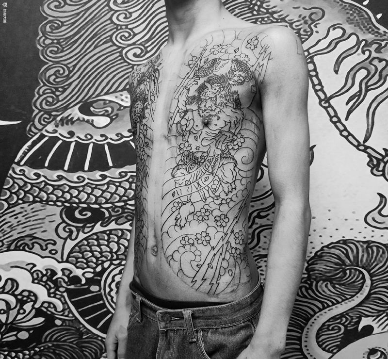 当前位置: 首页 >广东省惠州市纹身店-惠州山海刺青纹身工作室纹身图案>日式开衫纹身图片_胸部腹部老传统开衫风神雷神日式纹身图案