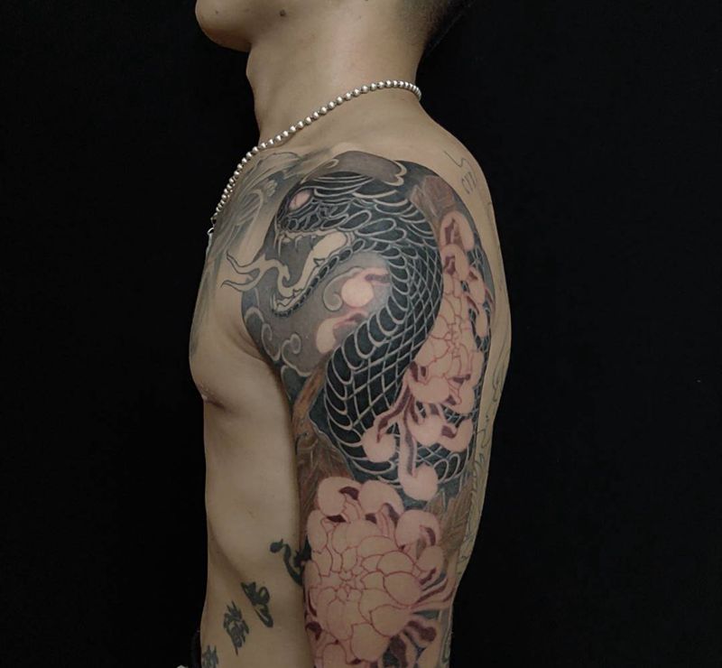 当前位置: 首页 >广东省惠州市纹身店-惠州山海刺青纹身工作室纹身图案>老传统蛇纹身图片_手臂老传统蛇菊花日式纹身图案