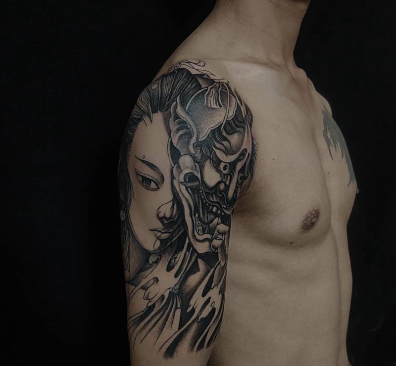 掩面艺伎纹身图片_手臂新传统艺伎班若新传统纹身图案