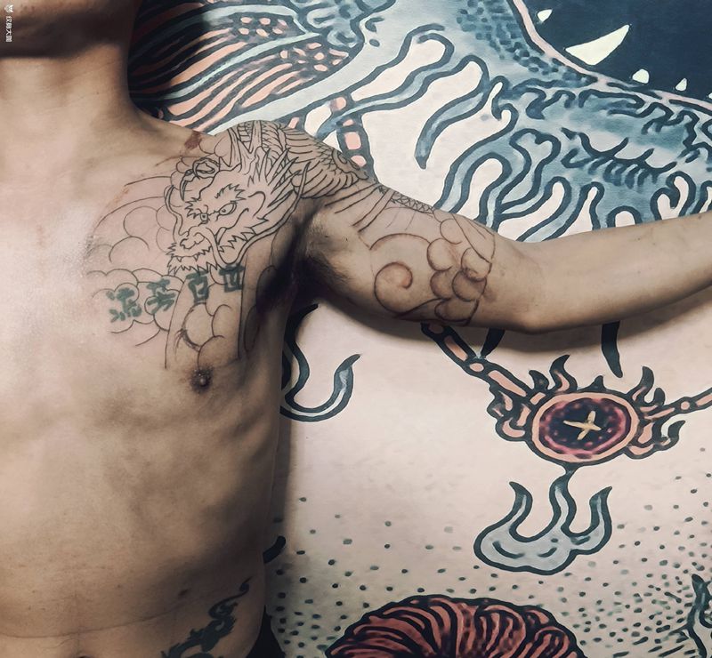 当前位置: 首页 >广东省惠州市纹身店-惠州山海刺青纹身工作室纹身图案>老传统半胛遮盖纹身图片_手臂胸部老传统龙半胛日式纹身图案