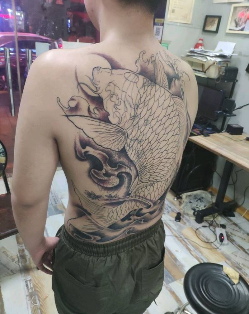 当前位置: 首页 >广东省惠州市纹身店-惠州山海刺青纹身工作室纹身图案>满背鲤鱼(黑灰已完)纹身图片