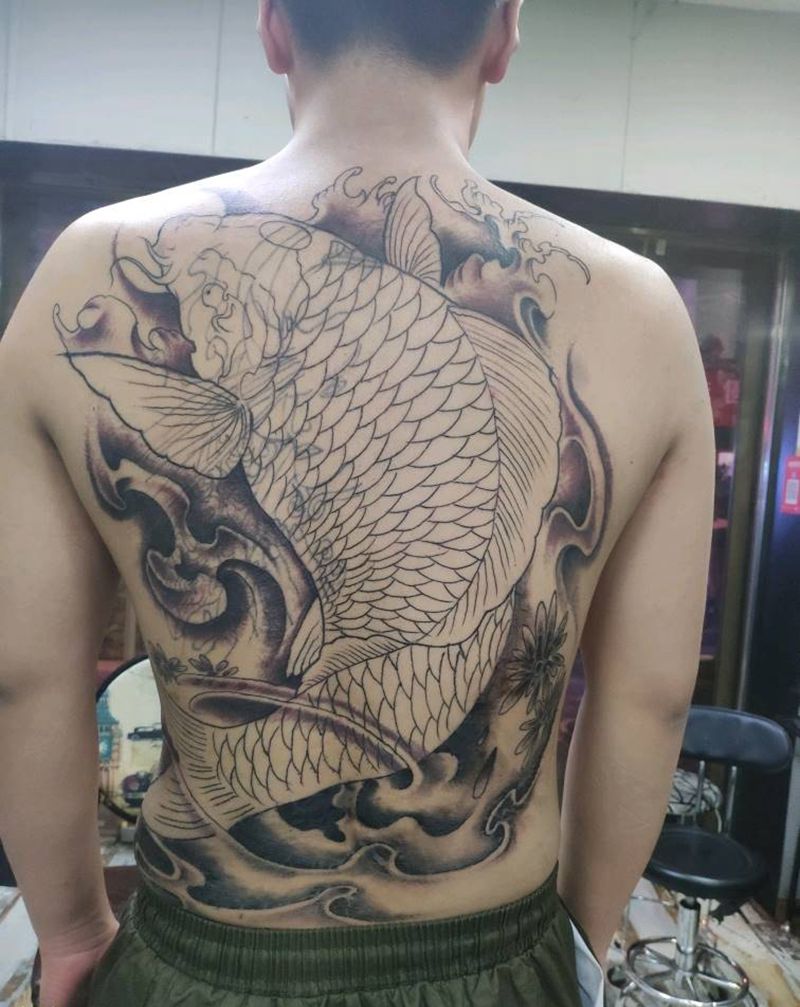 当前位置: 首页 >广东省惠州市纹身店-惠州山海刺青纹身工作室纹身图案>满背鲤鱼(黑灰已完)纹身图片