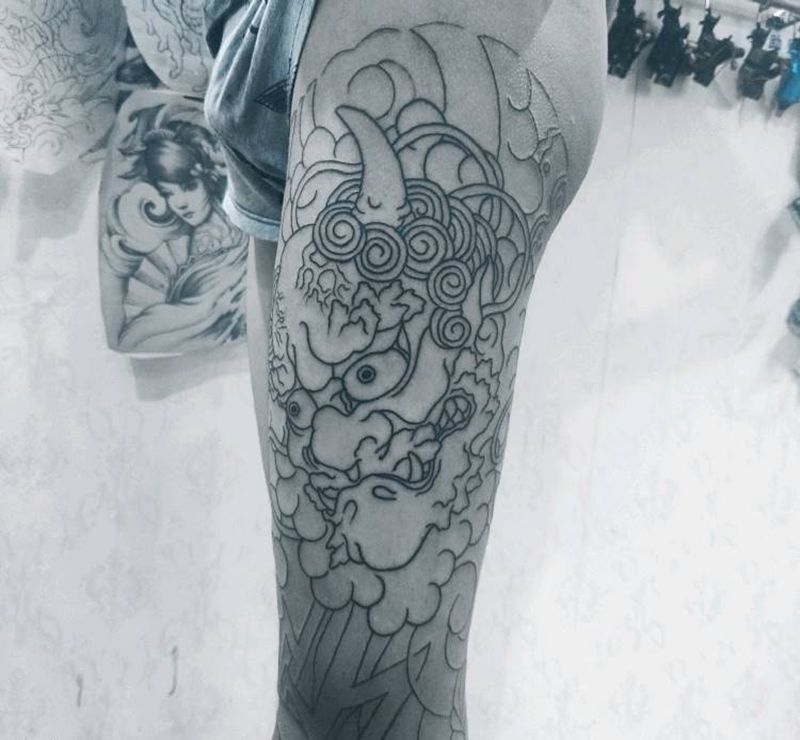 日式花腿 线纹身图片_腿部老传统日式 雷神纹身图案