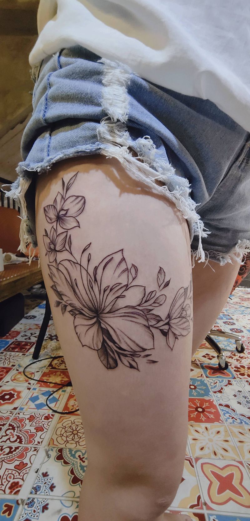 素花纹身图片_腿部素花纹身图案