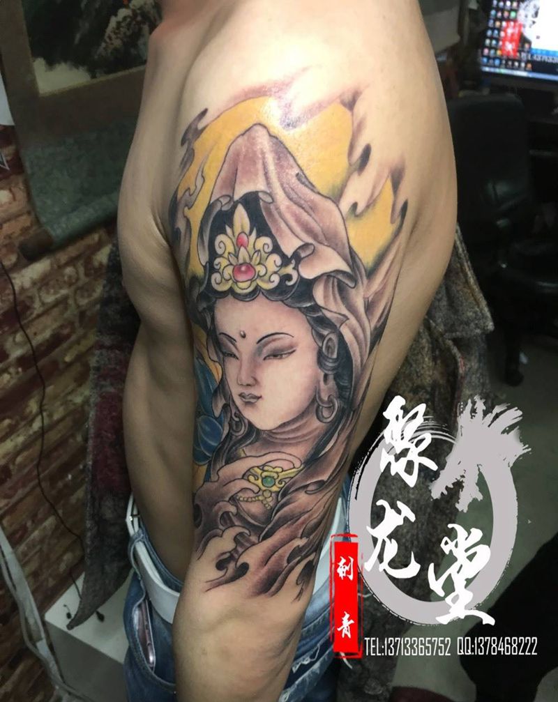 当前位置: 首页 >广东省惠州市纹身店-聚龙堂刺青纹身图案>观音纹身图片_成品手臂传统宗教人物纹身图案