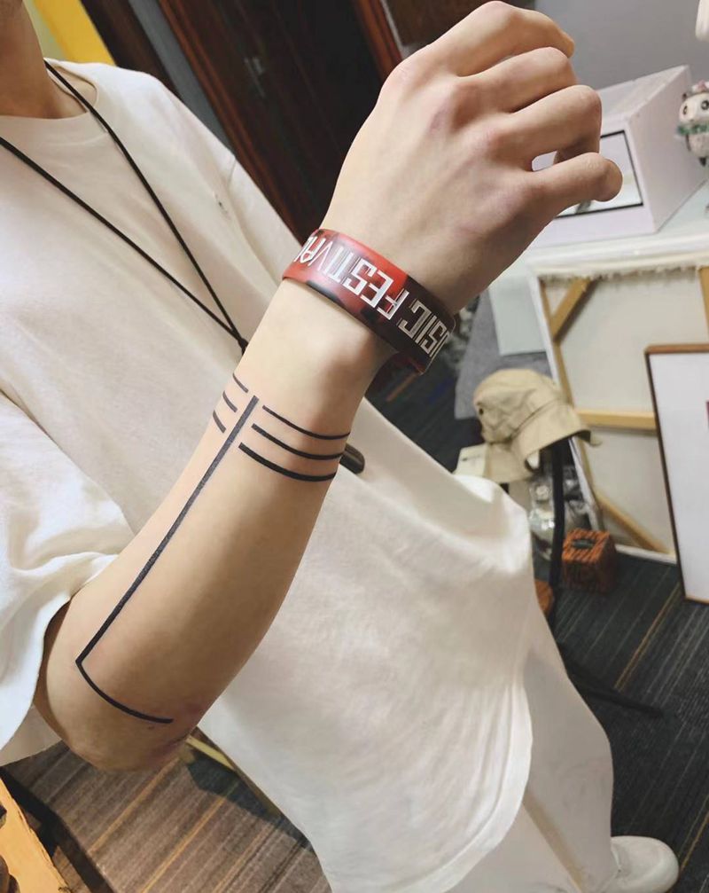 当前位置: 首页 >广东省汕尾市纹身店-丰翼轩刺青纹身图案>鼓手的线条纹身图片_手臂直线纹身图案