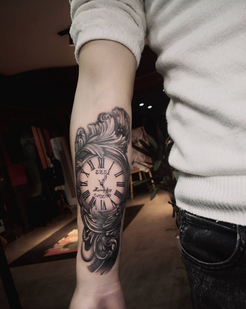 当前位置: 首页 >广东省惠州市纹身店-和刺青纹身图案>写实时钟纹身图片_手臂欧美写实纹身图案