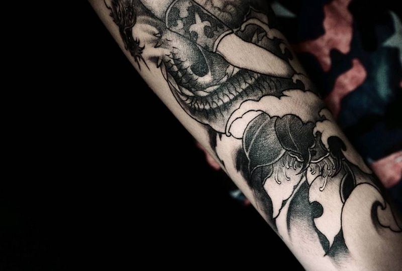 • T网红王老大花腿龙纹身图片_腿部新传统纹身图案
