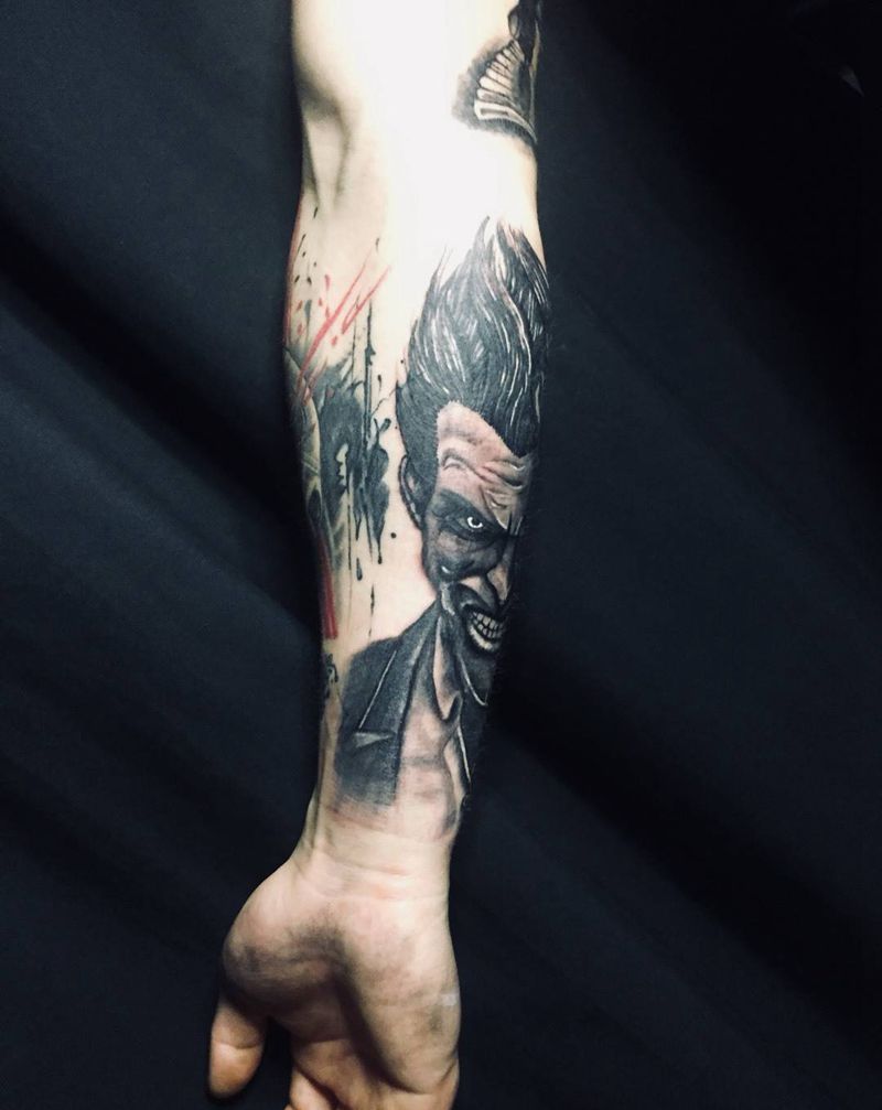 当前位置: 首页 >广东省惠州市纹身店-和刺青纹身图案>小丑男纹身图片_成品手臂欧美纹身图案