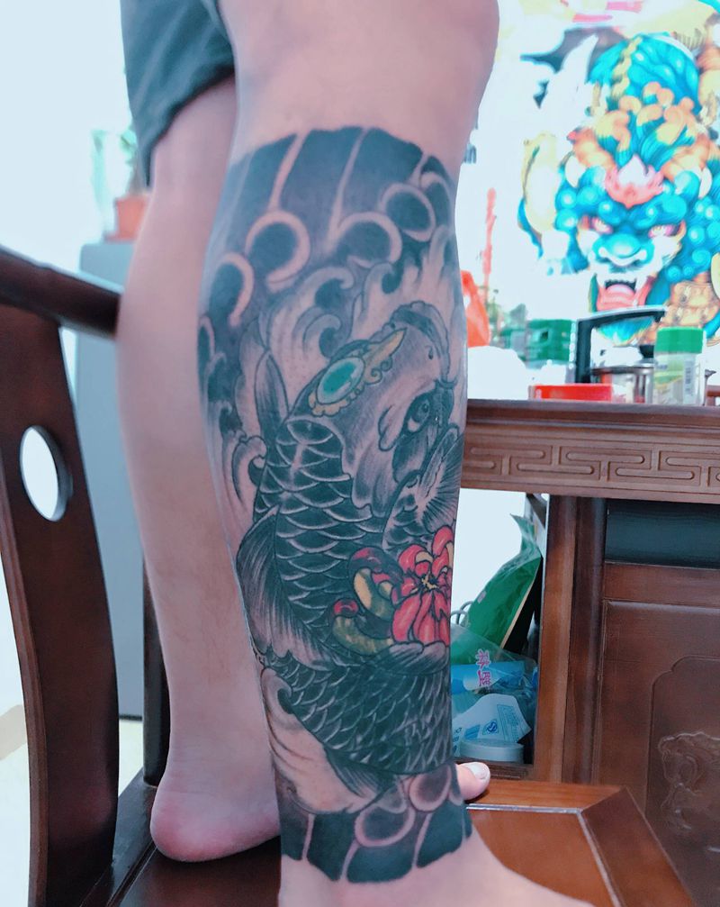 • T网红王老大花腿龙纹身图片_腿部新传统纹身图案
