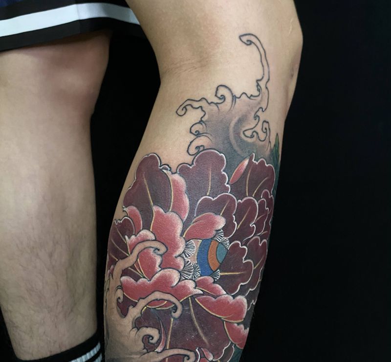 牡丹纹身图片_腿部老传统新传统纹身图案