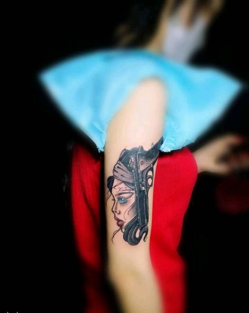 当前位置: 首页 >广东省惠州市纹身店-和刺青纹身图案>枪女纹身图片_手臂Old School欧美写实纹身图案