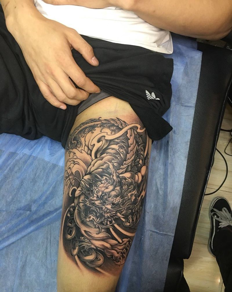 • T网红王老大花腿龙纹身图片_腿部新传统纹身图案