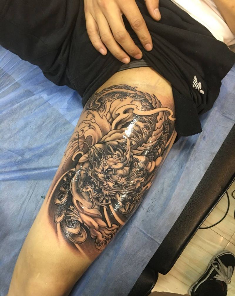 • T网红王老大花腿龙纹身图片_腿部新传统纹身图案