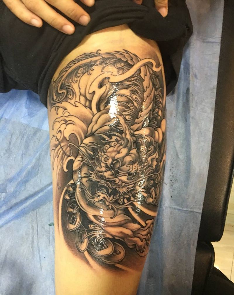 • T网红王老大花腿龙纹身图片_腿部新传统纹身图案