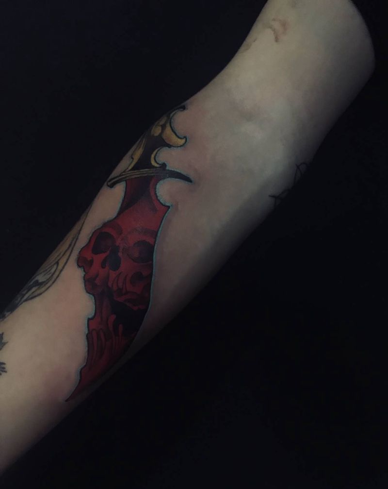 当前位置: 首页 >广东省惠州市纹身店-18Tattoo纹身图案>骷髅匕首纹身图片_New School纹身图案