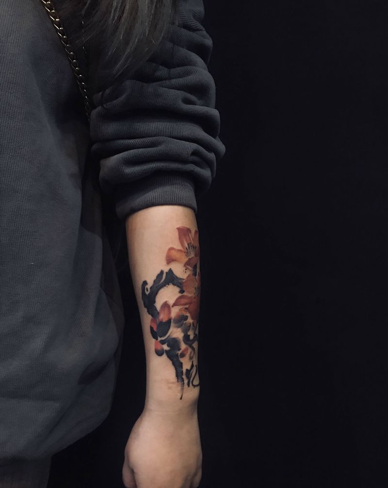水墨木棉花纹身图片_手臂水墨纹身图案
