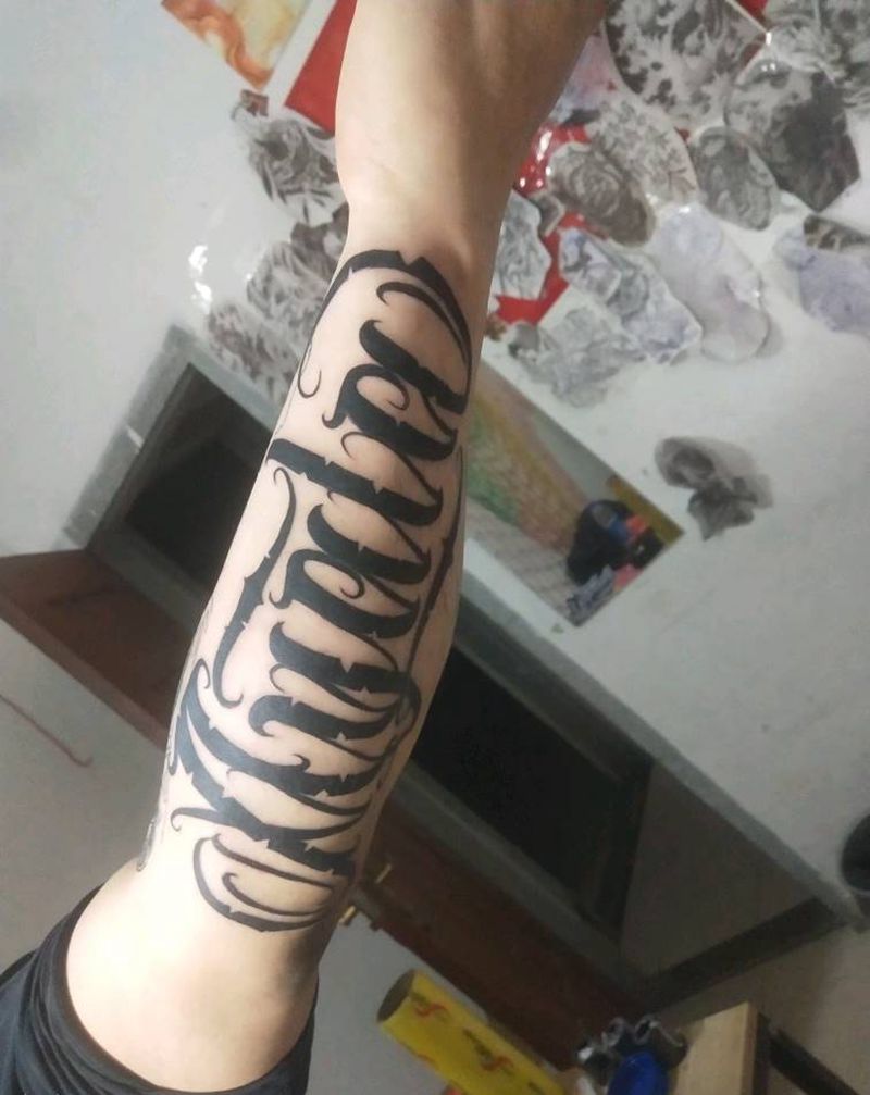 当前位置: 首页 >广东省汕尾市纹身店-東道主刺青纹身图案>拼接纹身图片_手臂Old School花体字纹身图案