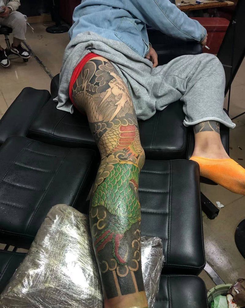 • T网红王老大花腿龙纹身图片_腿部新传统纹身图案
