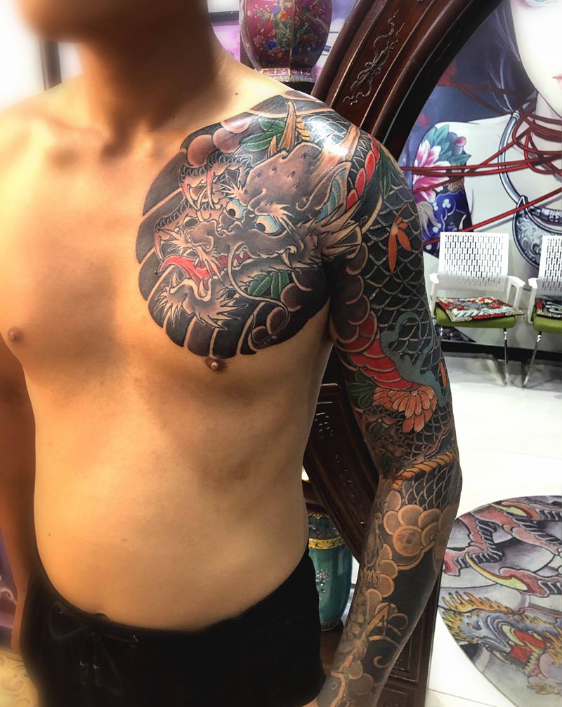 当前位置: 首页 >广东省东莞市纹身店-龙虎门刺青连锁机构纹身图案>老传统花臂纹身图片_手臂胸部老传统纹身图案