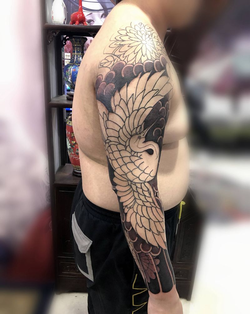 当前位置: 首页 >广东省东莞市纹身店-龙虎门刺青连锁机构纹身图案>老传统仙鹤花臂纹身图片_手臂老传统纹身图案