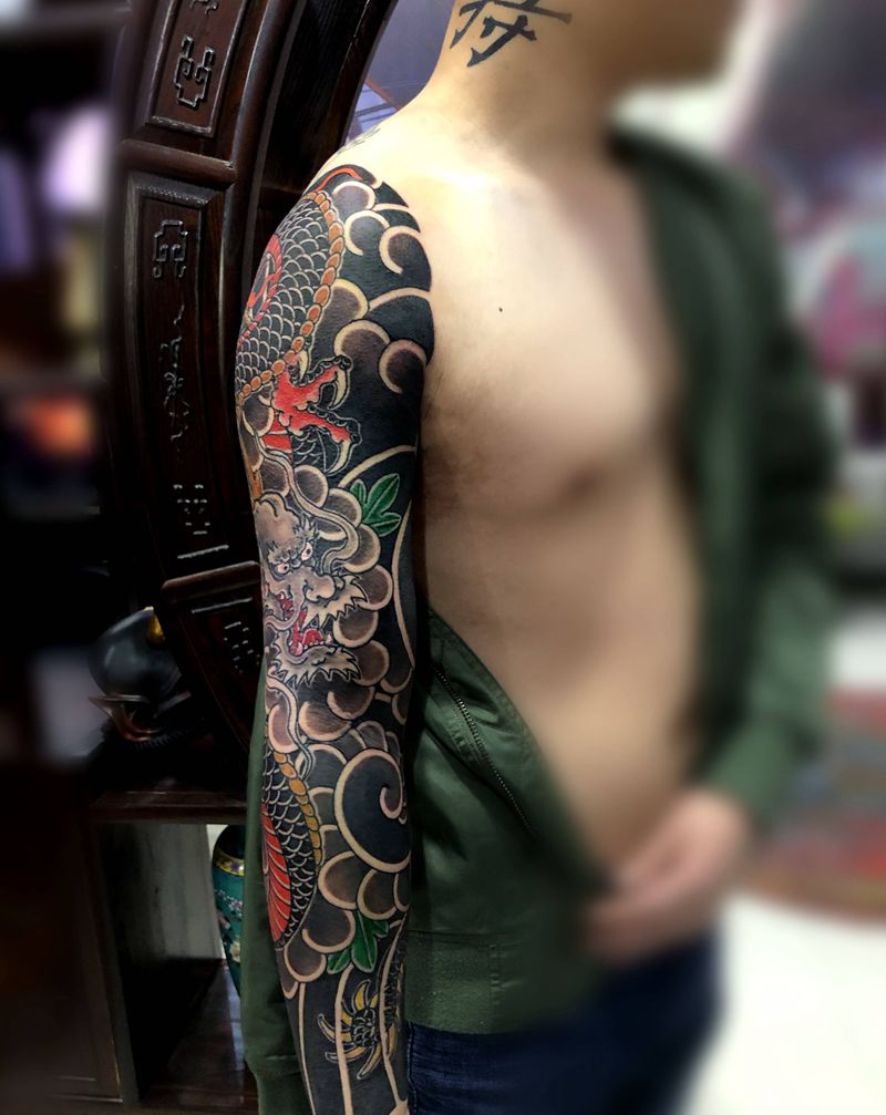 当前位置: 首页 >广东省东莞市纹身店-龙虎门刺青连锁机构纹身图案>老传统花臂完成纹身图片_手臂老传统纹身图案