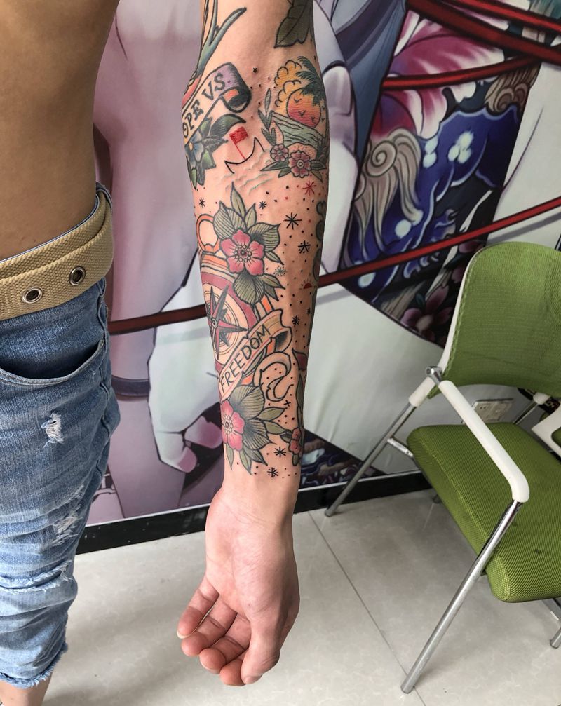 当前位置: 首页 >广东省东莞市纹身店-龙虎门刺青连锁机构纹身图案>欧美花臂,两次完成纹身图片_肩部纹身图案