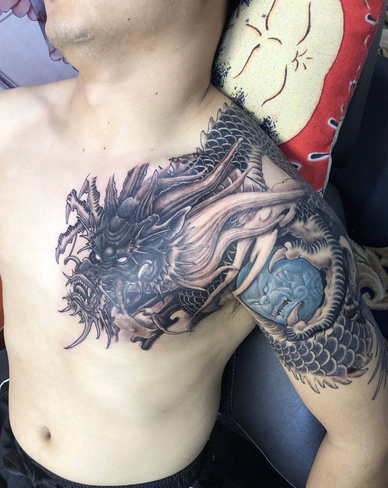 遮盖旧图作品纹身图片_肩部胸部纹身图案