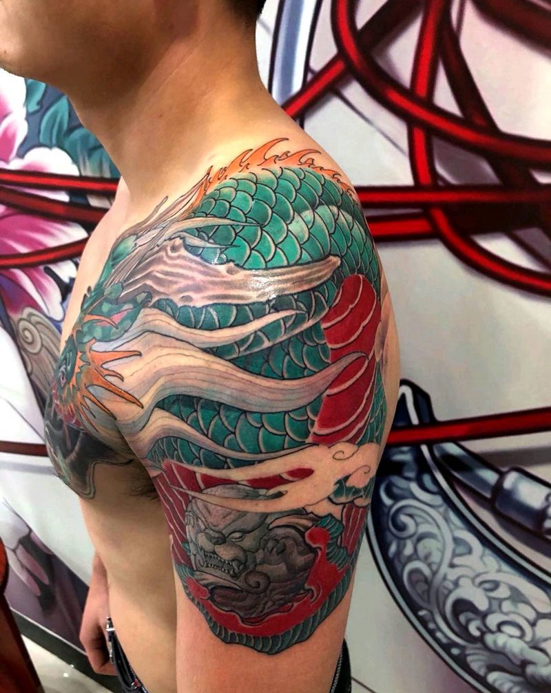 重彩遮盖旧图纹身图片_肩部胸部新传统龙盖狼头纹身图案
