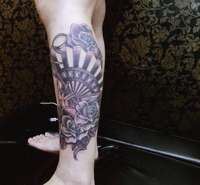 当前位置: 首页 >广东省东莞市纹身店-ET TATTOO纹身图案>小腿扇子纹身图片