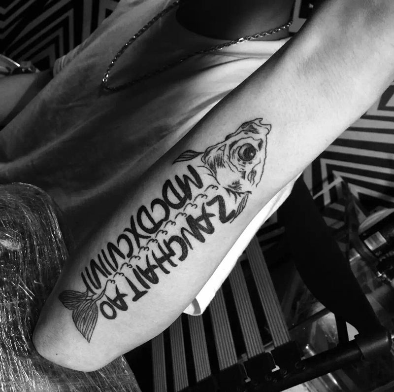 当前位置: 首页 >广东省东莞市纹身店-ET TATTOO纹身图案>咸鱼融合英文纹身图片